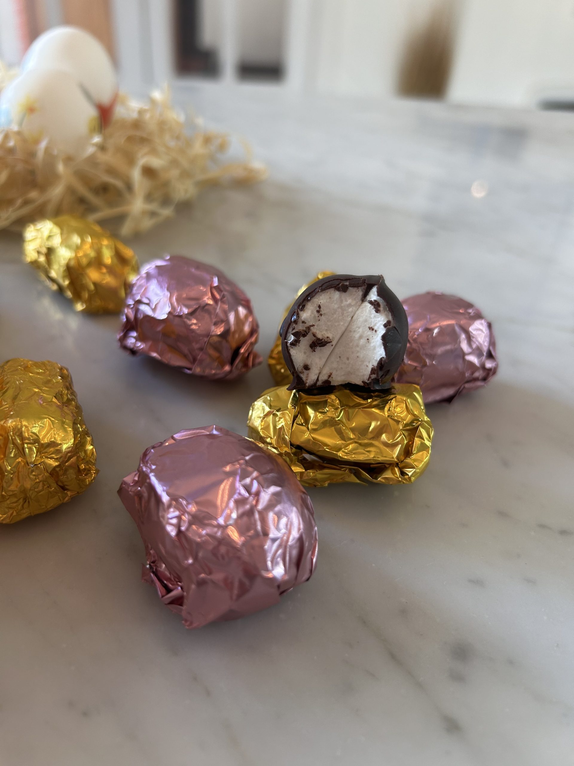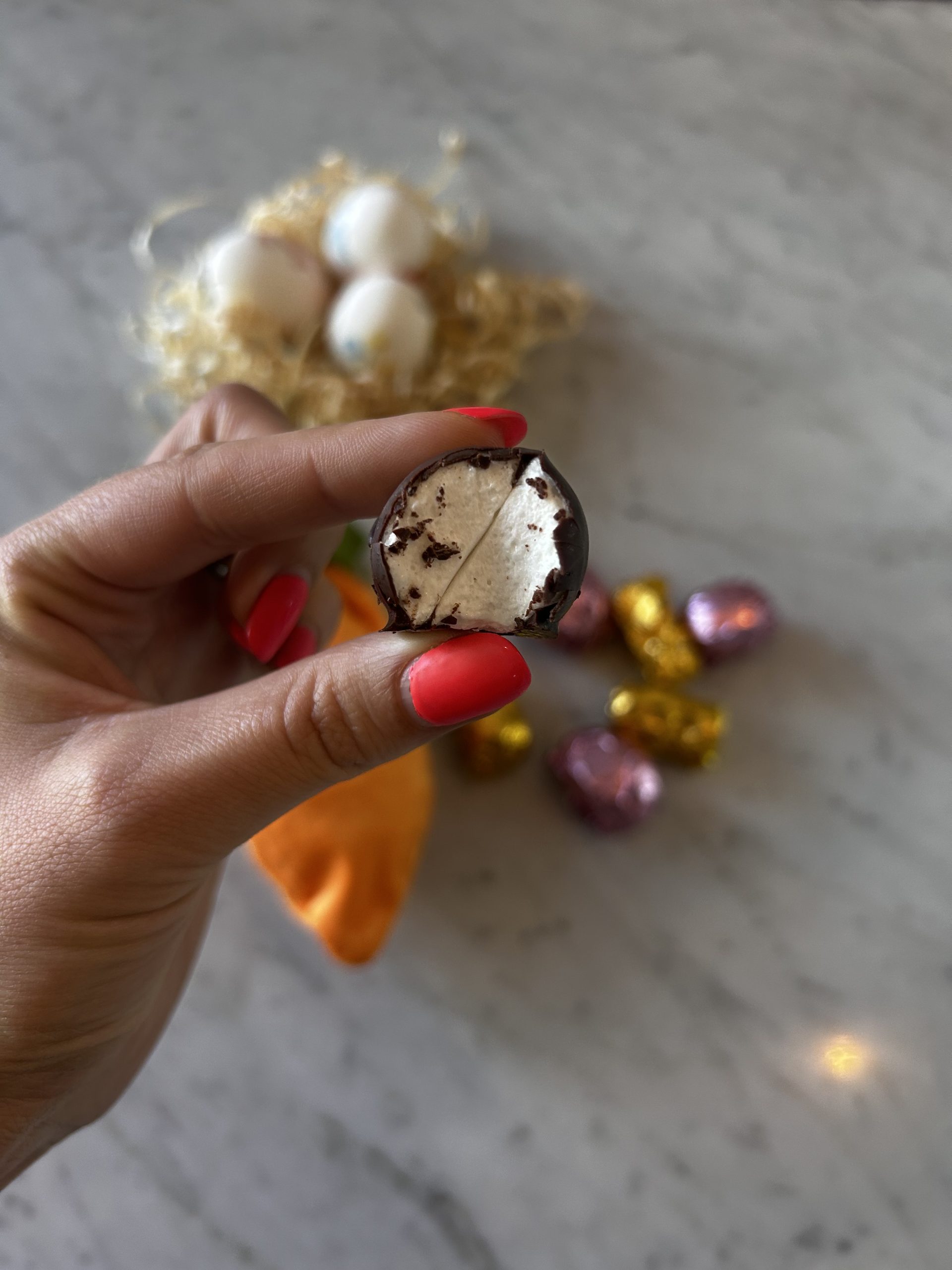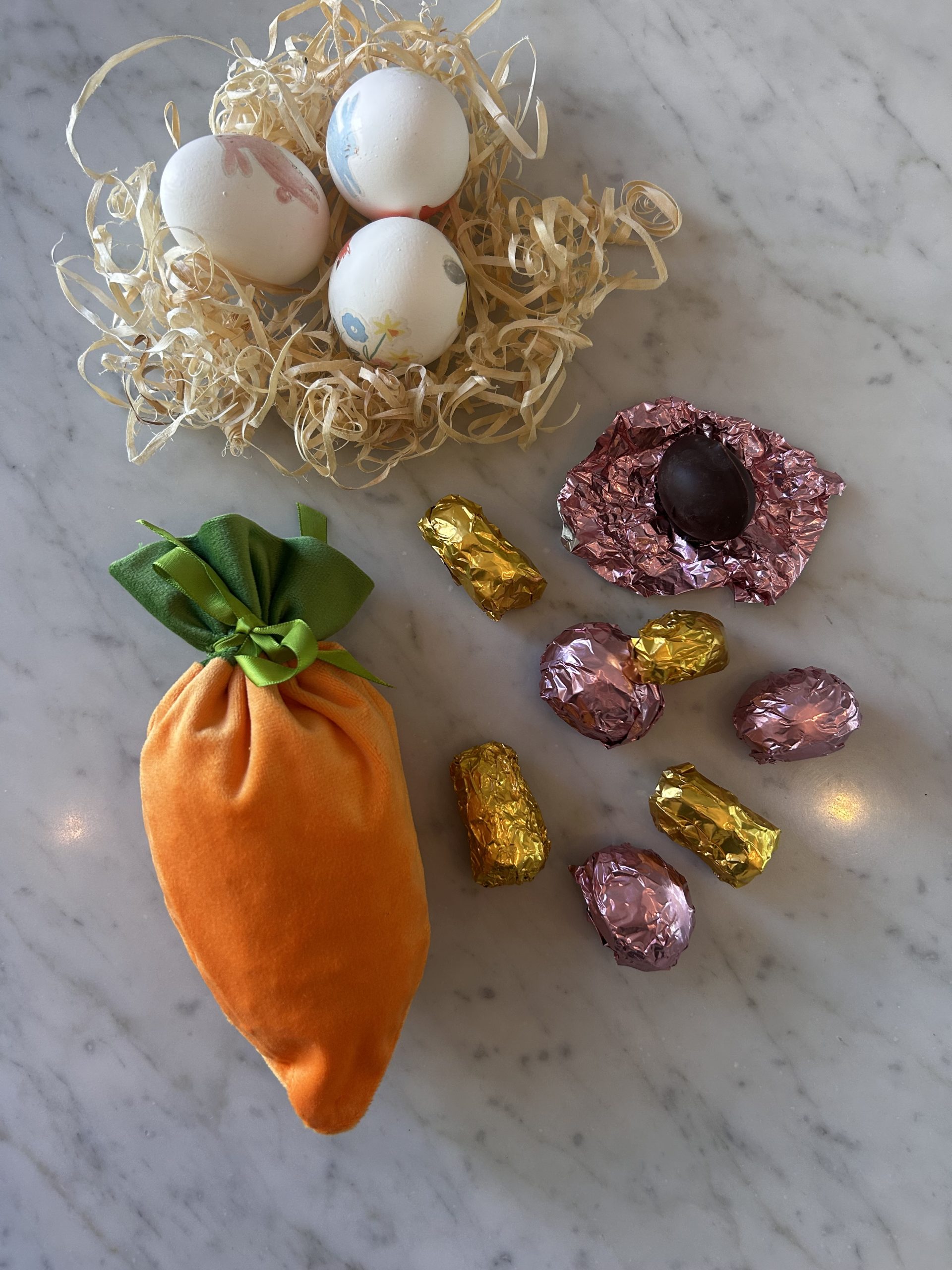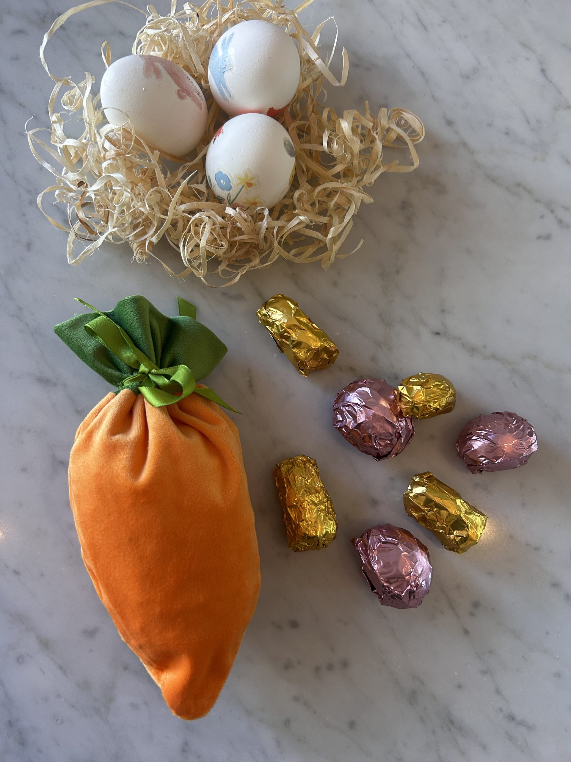 Bolsita con forma de zanahoria rellena de 7 unidades de malvas bañados en chocolate amargo.
